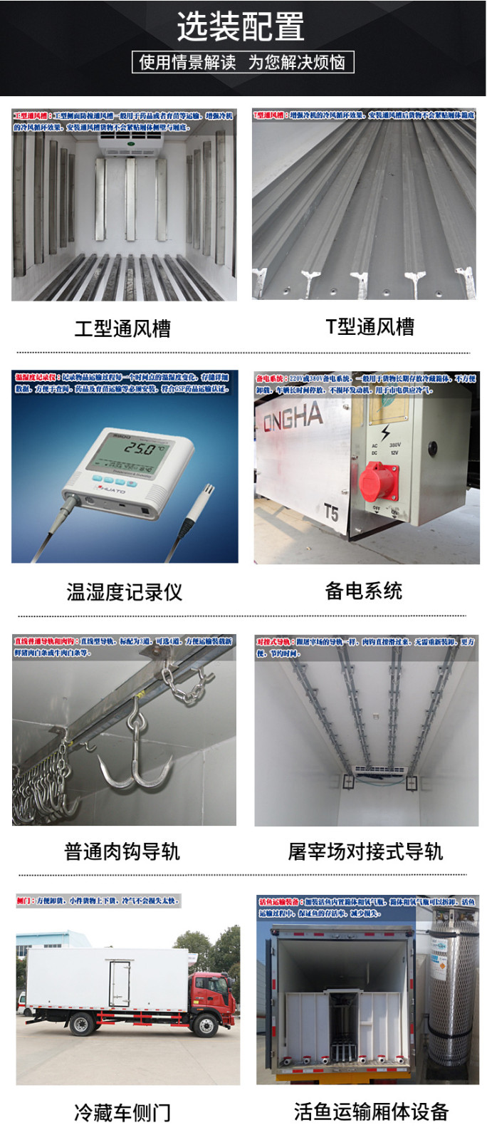 四、選裝配置:導(dǎo)軌肉鉤、T型通風(fēng)槽、右側(cè)開側(cè)門、溫度實時監(jiān)控帶打印裝置、裝海鮮廂體內(nèi)部面料必須選裝不銹鋼制造、可選裝12V-24V外接電源(車輛在停止時,廂體通過外接電源進(jìn)行制冷)。